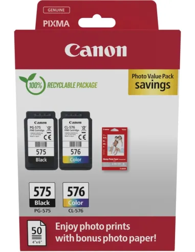 - Conditionnement : 1 Cartouche Noire PG575, 1 Cartouche Tricolore CL576, 50 feuilles de Papier Photo