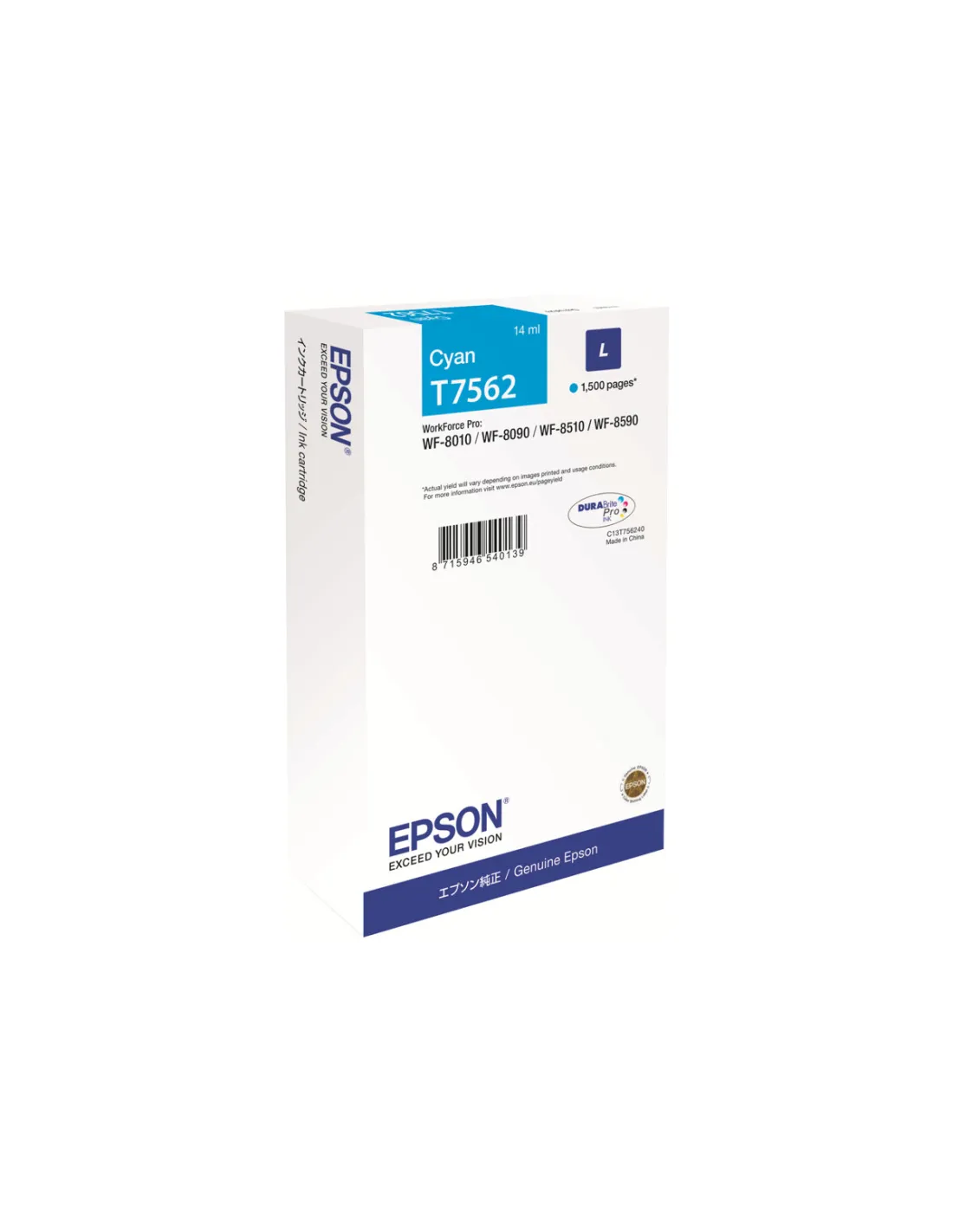 Découvrez la cartouche d'encre cyan Epson T7562 (C13T75624N), un consommable d'origine conçu pour offrir une qualité d'impression irréprochable et une compatibilité parfaite avec votre imprimante Epson WorkForce Pro. Sa technologie d'encre avancée garantit des couleurs vives, une netteté exceptionnelle et une durabilité accrue de vos documents.